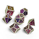 Whispers echo through crumbling streets and forgotten halls — the Storybook – Heart of the Desolate City dice set carries the weight of ruins long abandoned. Forged in antique silver and veined with deep purple enamel, these dice embody both the beauty and sorrow of a city lost to time. Each roll feels like uncovering relics of a forgotten age, making them a perfect companion for tales of tragedy, resilience, and enduring legends.