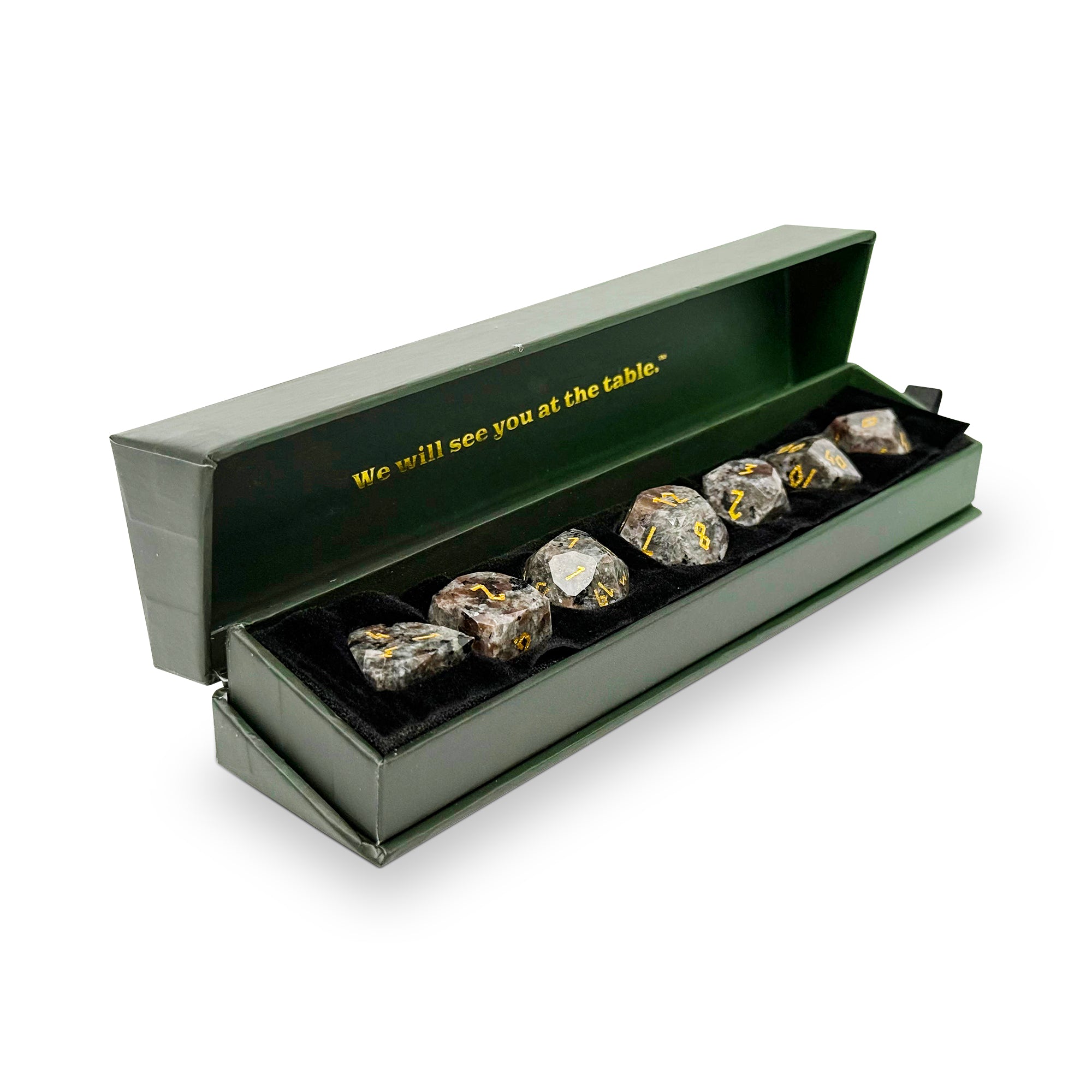 Shaped in our signature Wondrous Cut, these dice stand out immediately with their unique, non-traditional faceting. Unlike standard polyhedral shapes, the Wondrous Cut design enhances the stone’s natural depth, giving every dice face an intriguing, sculpted character while maintaining reliable functionality.