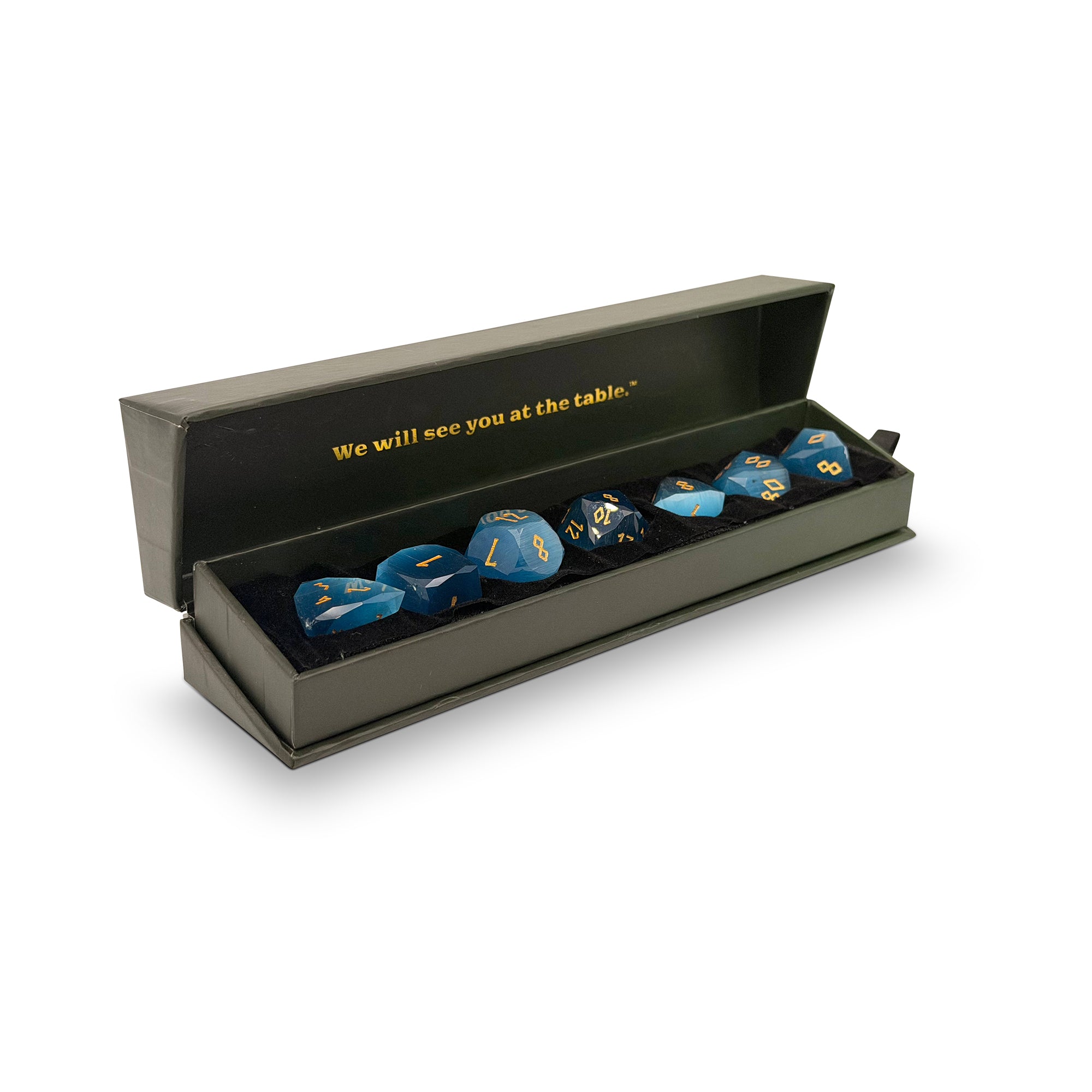 Bring the serene beauty of the ocean to your tabletop with the Frosted Ocean Blue Cat’s Eye 7-piece RPG dice set. Each die is crafted from glass with a wondrous cut, capturing the frosted, translucent hues of ocean blue that shimmer with every roll. The gold numbering provides a striking contrast, ensuring clarity while adding a touch of elegance. Perfect for gamers and collectors who want a set that is both visually stunning and highly functional.