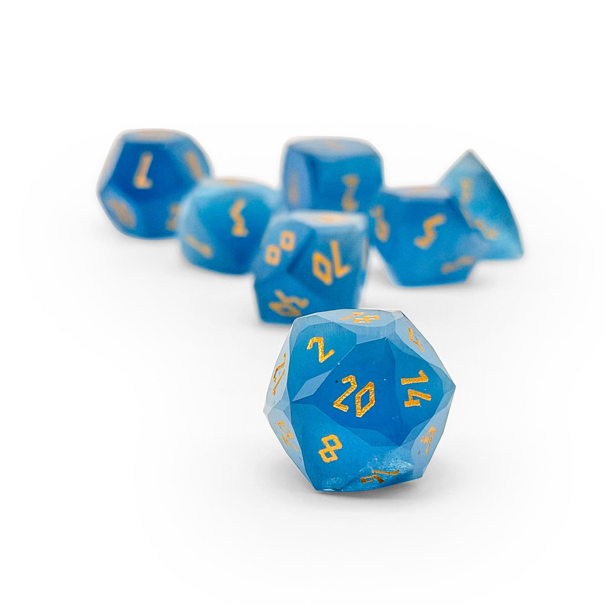 Frosted Ocean Blue Cat’s Eye w/ Gold Font - 7 Piece RPG Set Glass Wondrous Cut Dice