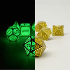 Material: Alloy metal with enamel inlay Finish: Polished gold frame with matching gold fill Special Feature: Glow-in-the-dark accents Weight: Approx. 8 oz per 7-dice set