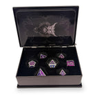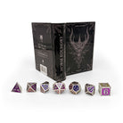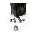 Whispers echo through crumbling streets and forgotten halls — the Storybook – Heart of the Desolate City dice set carries the weight of ruins long abandoned. Forged in antique silver and veined with deep purple enamel, these dice embody both the beauty and sorrow of a city lost to time. Each roll feels like uncovering relics of a forgotten age, making them a perfect companion for tales of tragedy, resilience, and enduring legends.